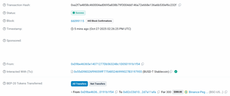 - Пример комментария: -300 USDT, Oct-27-2025 02:26:25 PM, 0xa2f7a4858c460004ad0695a838b79f3004dd146a72e668e136a6b530ef6c232f