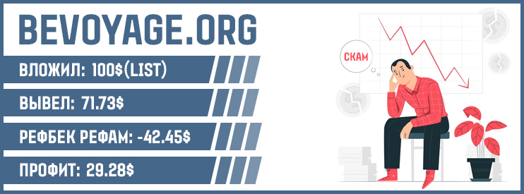 Bevoyage.org — после добавления на блог проект проработал 12 дней. Профит получить не удалось, фиксируем потери -83.9%. У админа случился определенный форс-мажор, возможно нам увеличит страховку. По проекту есть страховка на 200$, можете отправлять свои заявки на компенсацию.