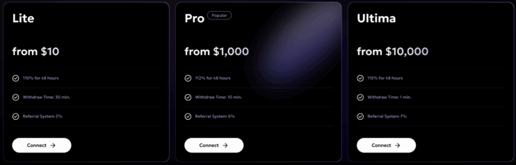 Пример: вы вложили 100$. Через 2 дня вы получите 110$. Чистая прибыль за круг составит +10$.