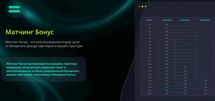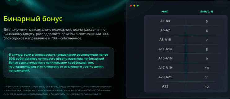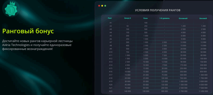 Всем привет! Добавляю на блог новый инвестиционный проект с консервативной доходностью Ai4ria.com. Старт был 9 сентября 2025 года. В Ai4ria будет уклон на развитие через сетевых лидеров и движения по земле. Тариф представлен один: 0.6-1.2% в сутки на протяжении 1 года, при средней ставке в 0.8% до точки безубытка 125 дней, далее уже профит. Ввод и вывод сейчас работает только через USDT. Наибольший интерес новинка представляет своей разветвленной партнерской программой с бинарными, ранговыми и матчинг бонусами. Пока что проект особо нигде не светится, точка входа сейчас однозначно будет выгодной. Для заказа выплат здесь обязательно требуется подключать 2fa, сами выплаты ручные от 10$ с комиссией в 3% + 1$. Желаю удачных инвестиций!