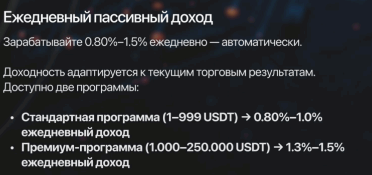 Наш ИИ анализирует терабайты данных — от истории торгов до мировых новостей и трендов в закрытых сообществах — для принятия решений с высочайшей точностью. Вы получаете прибыль каждый день. Процент динамичен (0.80-1.5%) и зависит от успешности торгов, обеспечивая прозрачность и стабильный рост вашего капитала. Мгновенный вывод средств, интуитивно понятный интерфейс в Telegram и многоуровневая партнерская программа. Ваш доход в ваших руках.