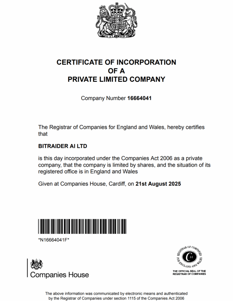 Сертификат о регистрации компании BITRAIDER AI LTD №16664041 в Великобритании: