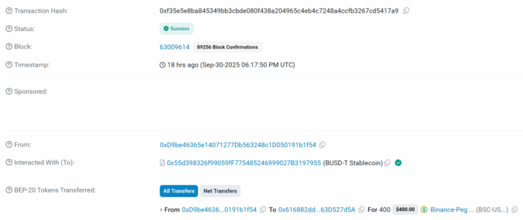 - Пример комментария: -400 USDT, Sep-30-2025 06:17:50 PM, 0xf35e5e8ba845349bb3cbde080f438a204965c4eb4c7248a4ccfb3267cd5417a9