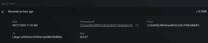| 29/09/2025 09:25 | ke*** | 26$ / 1.17$ | 0x5*** | Выплачено |