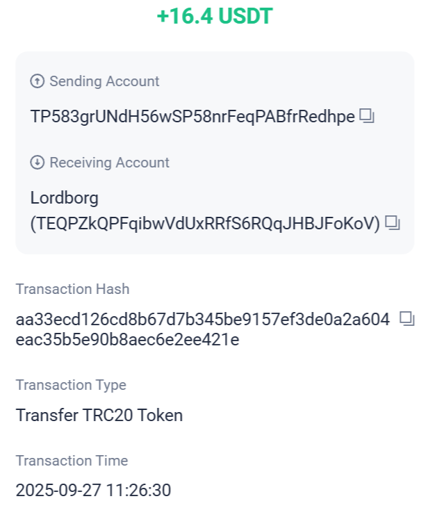 | 27/09/2025 16:59 | 19*** | 56$ / 1.68$ | TFJ*** | Выплачено |