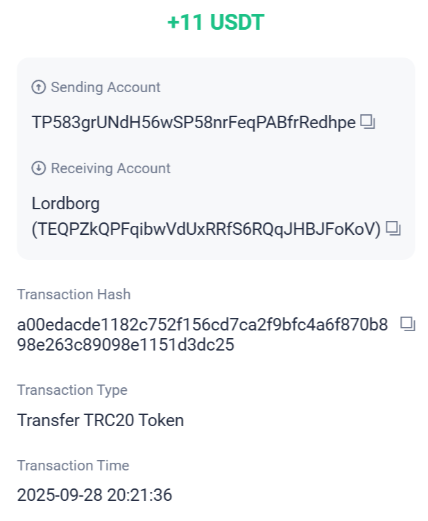 | 28/09/2025 17:31 | ri*** | 10$ / 0.45$ | TT8*** | Выплачено |
