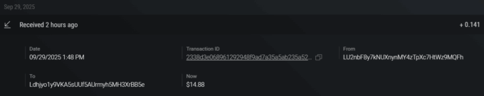 | 26/09/2025 14:10 | Ga*** | 15$ / 0.45$ | 0xA*** | Выплачено |