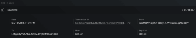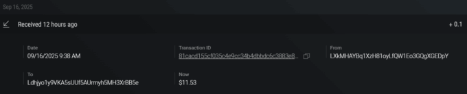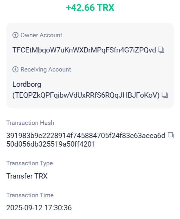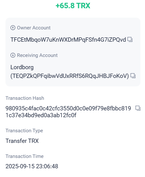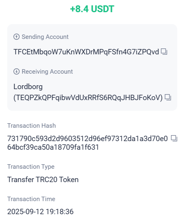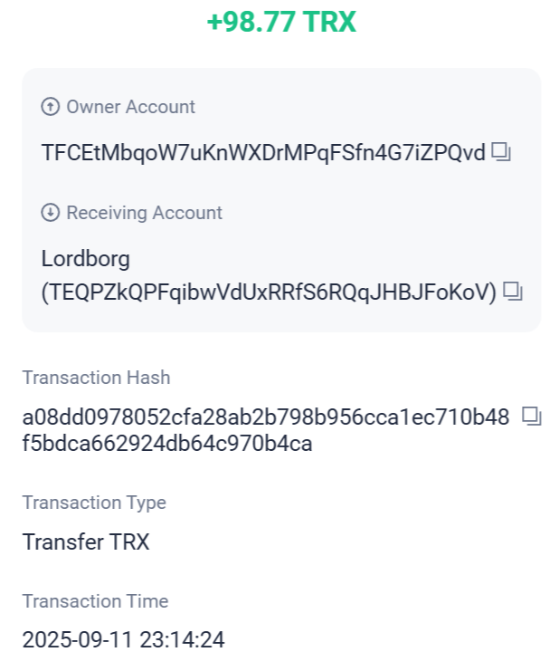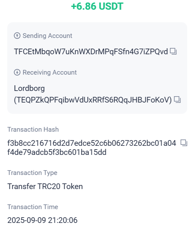 -200 USDT, Sep-14-2025 13:36:28, 0x7e63c2ef62126cb1c95c364216a0c6a50cc9a4dd633ed1ba03e33eecb13fba01