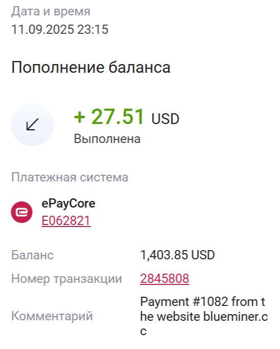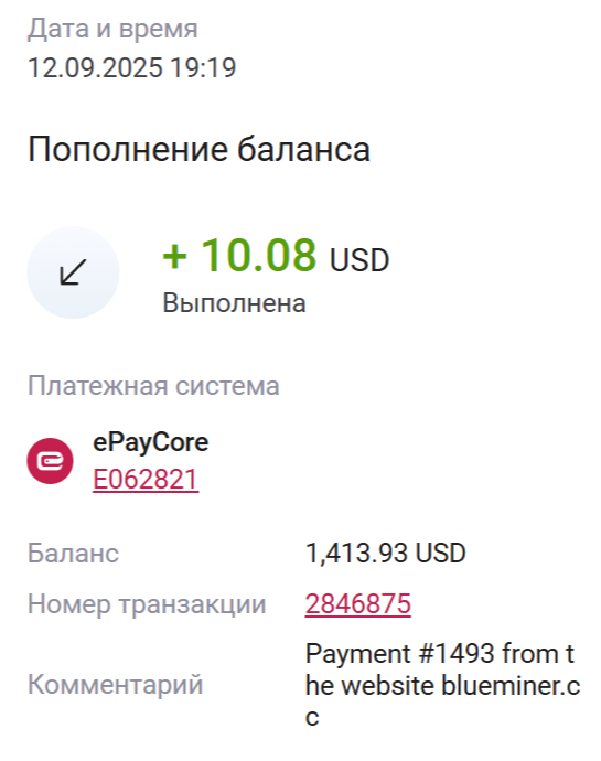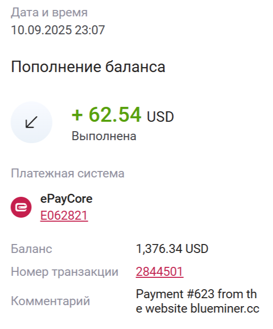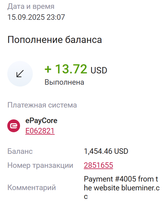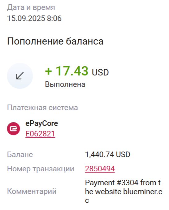 - 100.5 USD 14.09.2025 22:54 Выполнена Платежная система ePayCore E062821 Зачислено 100 USD Номер транзакции отправителя 2850092 Комментарий Account replenishment #2001 for