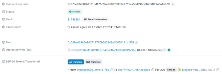 - Пример комментария: -300 USDT, Feb-17-2026 12:32:41 PM, 0x673e934089b2f81cd175592e9508788d7c2761aa5bd895cd16d5ff9140a16309