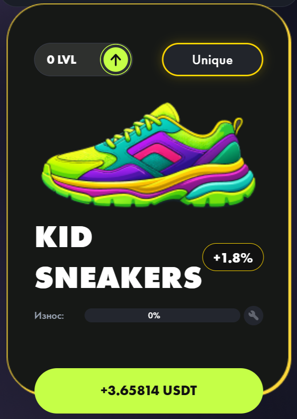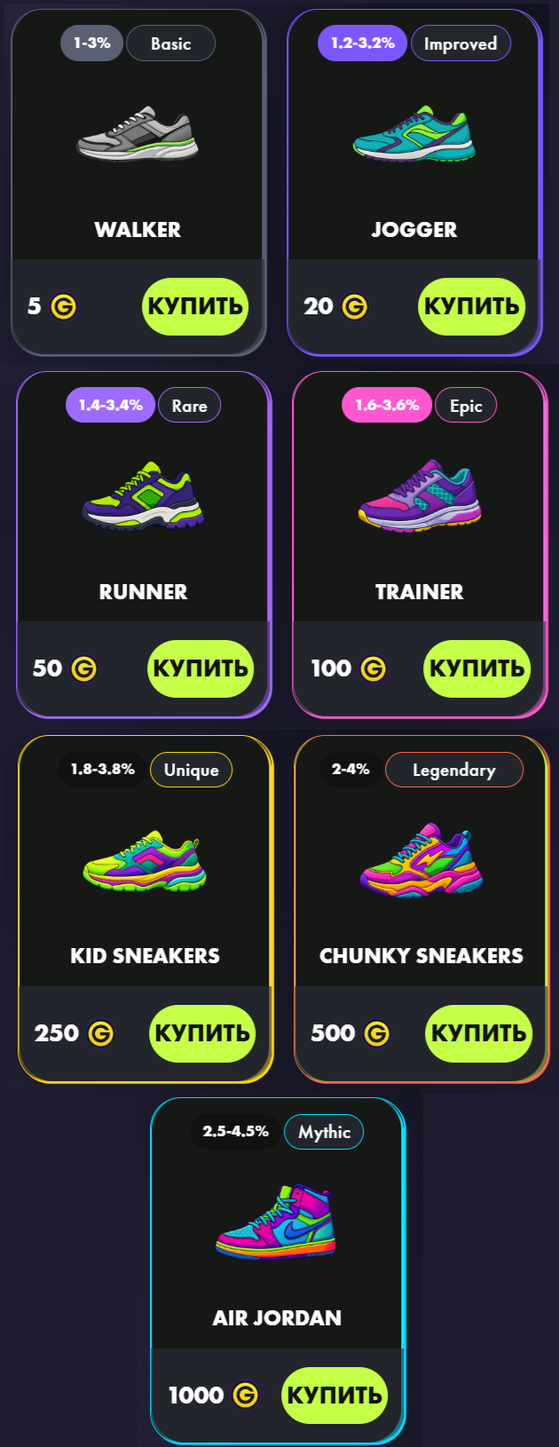 Каждые 48 часов бесплатно и моментально можно улучшить кроссовок на +1 уровень, это навсегда увеличивает доходность на +0.2% в сутки. Всего уровней 10.