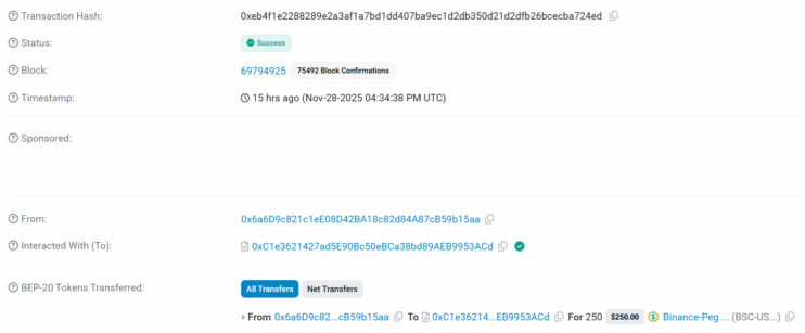 - Пример комментария: -250 USDT, Nov-28-2025 04:34:38 PM, 0xeb4f1e2288289e2a3af1a7bd1dd407ba9ec1d2db350d21d2dfb26bcecba724ed