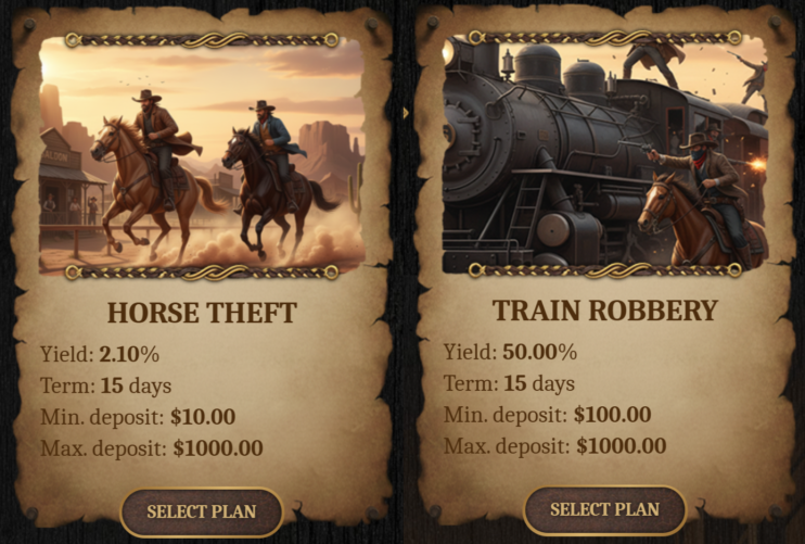 Крутой хайп проект с ковбоями, револьверами, пулями и мешками с золотом. Настоящий вестерн! Маркетинг не отстает от внешней оболочки — доходность более чем привлекательная! Надеюсь, что новинка надолго к нам пришла. Закидывать сильно не советую, проверяем админа вкладами на 100-200$.