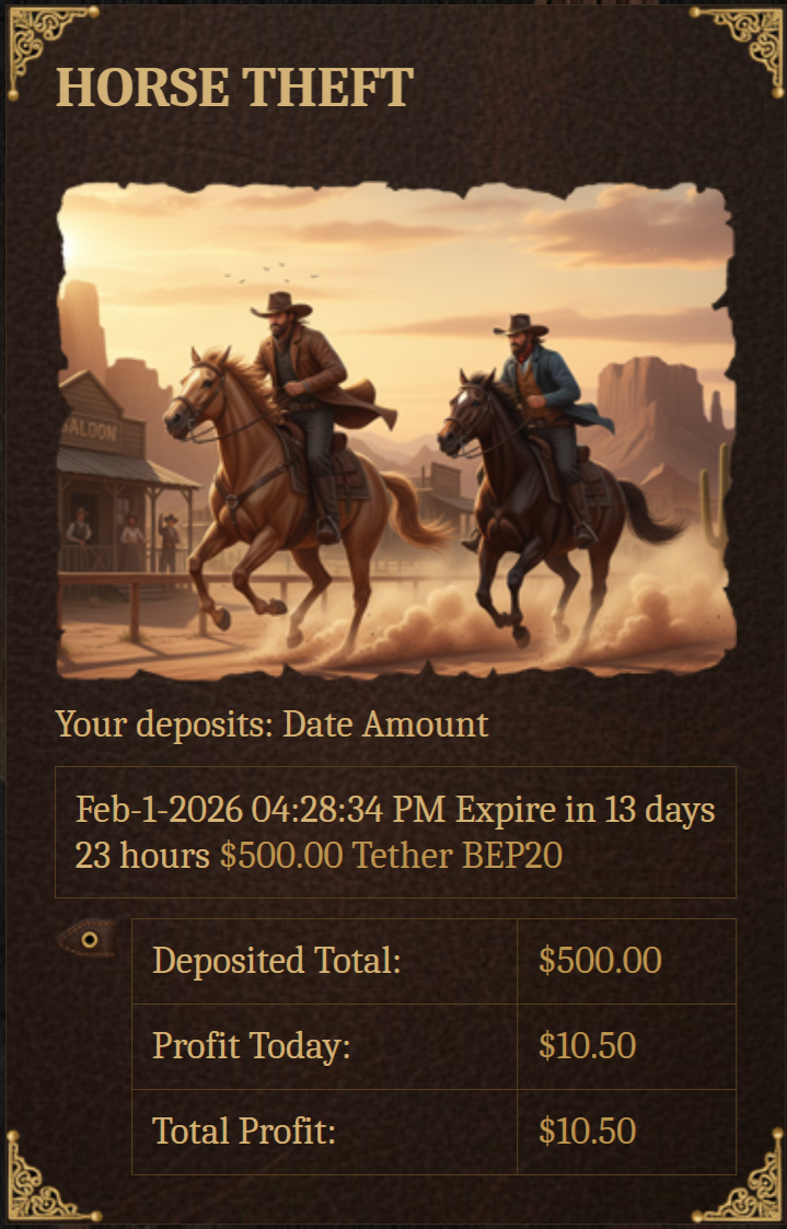 HORSE THEFT 10-1000$ 2.1% в сутки на 15 дней (итого 131.5%)