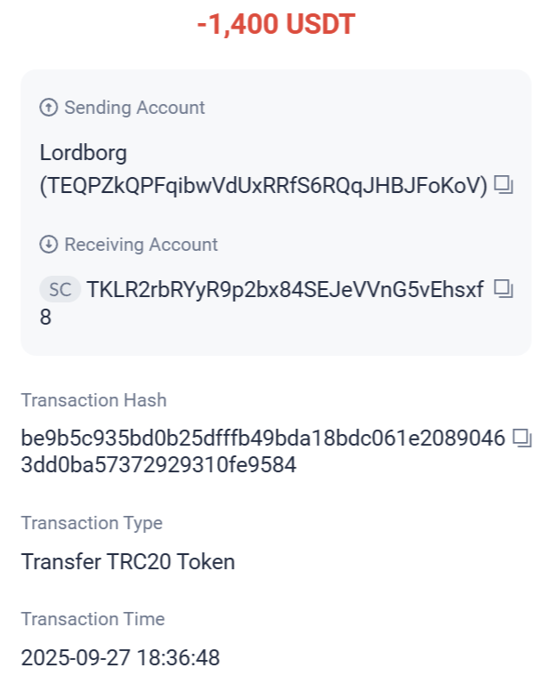 - Пример комментария: -1400 USDT, 2025-09-27 15:36:48, be9b5c935bd0b25dfffb49bda18bdc061e20890463dd0ba57372929310fe9584